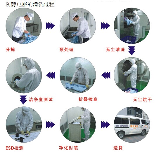 無塵服、潔凈服、防靜電服的最重要的一個環節就是清洗,而清洗又必須在潔凈室內進行,并包裝好。對于無塵服、潔凈服及防靜電服的清洗一般是每周至少一次,有些要求高的工種需要每天洗滌一次。